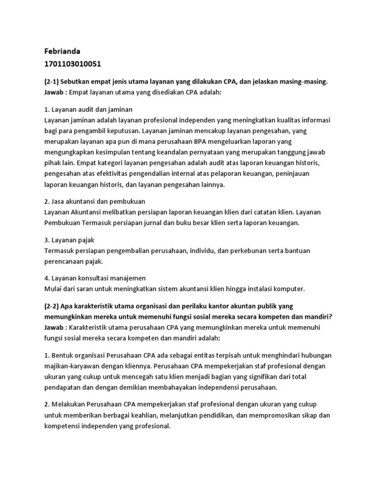 Kunci jawaban auditing dan jasa assurance, jilid 1, edisi 15, by arens et al. 152552109 auditing ii jawaban tugas arens. (2) pemeriksaan atas setiap bond trust indenture. Kunci jawaban jasa audit dan assurance ( arens , dkk ). Kunci jawaban auditing dan jasa assurance jilid 1 arens full rar rapidshare.